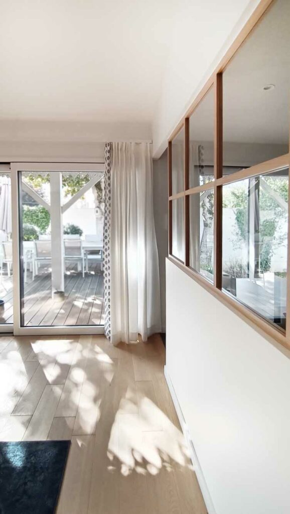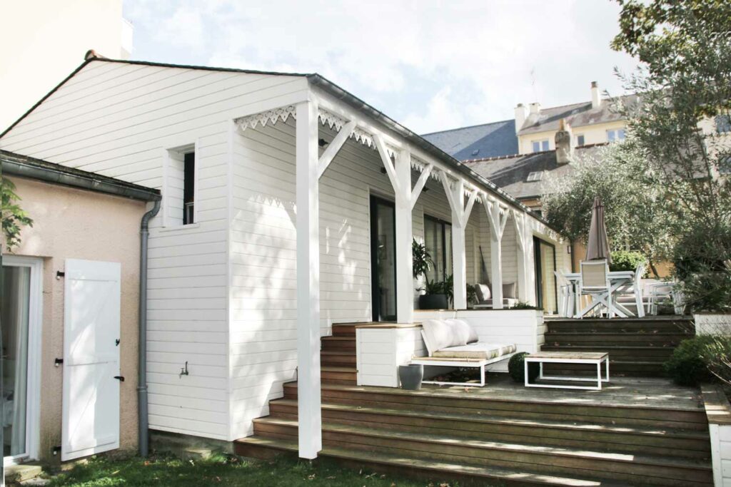 L’objectif était d’élever la majeure partie de la maison au-dessus du niveau d’inondation de la Vilaine. Ce rehaussement a généré un jeu de terrasses et jardinières qui amène naturellement vers le jardin. L’aspect extérieur – la remise en place du lambrequin et l’alliance entre le bois (Ipé) et le bardage en bois blanc – donne son caractère à l’ensemble.