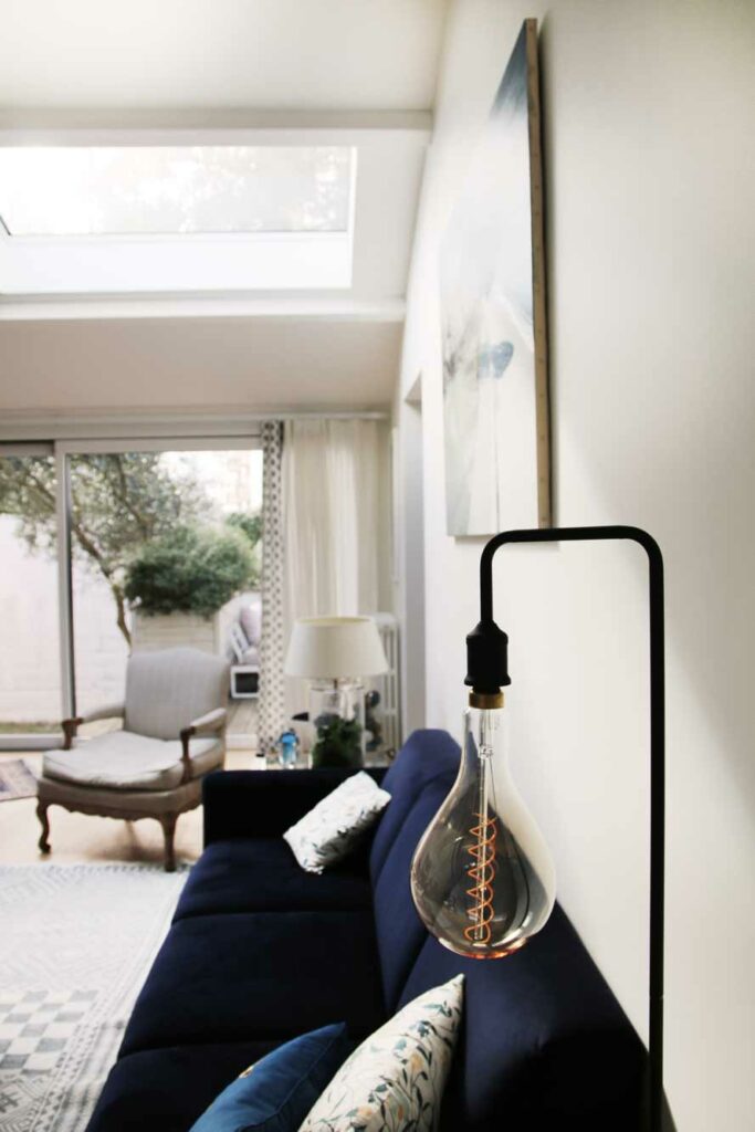 À l’intérieur, la lumière abonde et met en valeur les généreux espaces de réception. Un escalier en acier courbe vient assurer la liaison entre la maison d’origine et l’extension.